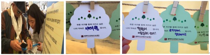 캠패인 부스를 직접 기획 운영한 블랙야크청년셰르파들은 현재 국가에서 미세먼지 저감을 위해 시행하고 있는 다양한 노력, 정책들을 OX 퀴즈를 통해 참여시민들과 재미있게 공유하였습니다. 뿐만 아니라 민간차원의 일환으로 블랙야크과 블랙야크강태선나눔재단에서 진행하고 있는 다양한 사회공헌 캠페인 활동을 공유하며 메모지에 미세먼지를 줄이기 위한 나만의 노력을 적으며 함께 다짐하는 시간을 가졌습니다.